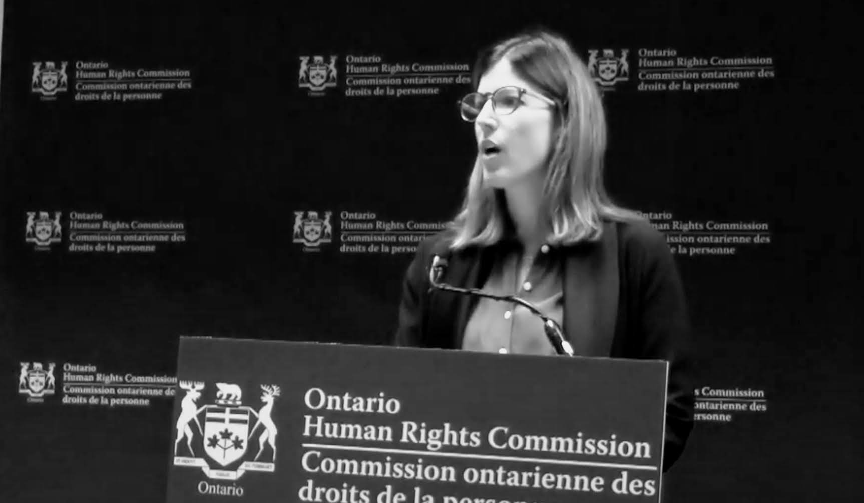 Lark speaking at the launch of the Right to Read inquiry which, over years, culminated in Ontario reading curriculum change.