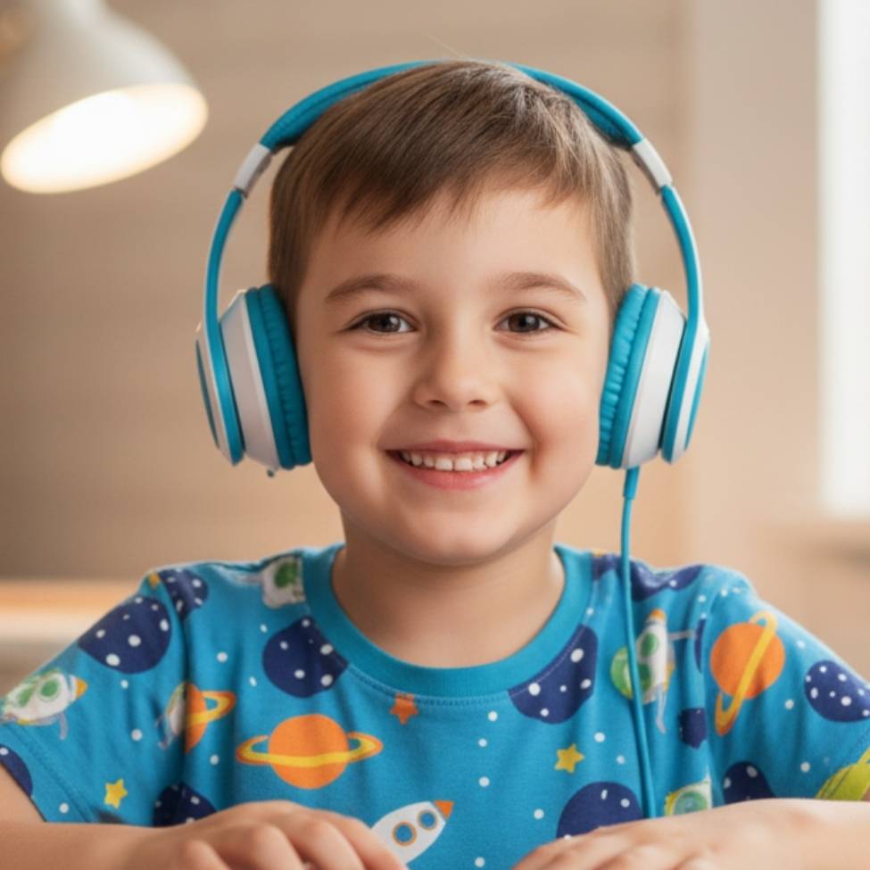 Young girl wearing large headphones in a classroom setting